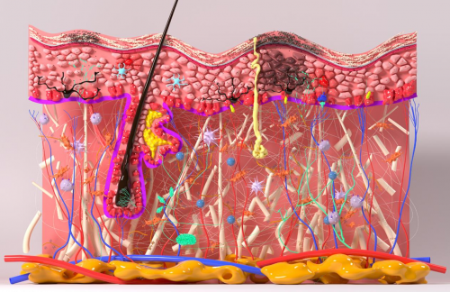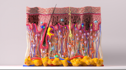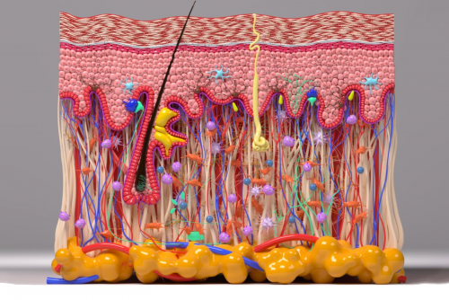 自致密排列的角质层至代谢活跃的基底层,从富含胶原的真皮基质至脂质丰盈的皮下组织,模型精准再现了健康皮肤作为生物屏障的“砖墙结构”及高效物质转运通路,为理解皮肤生理功能奠定形态基础。