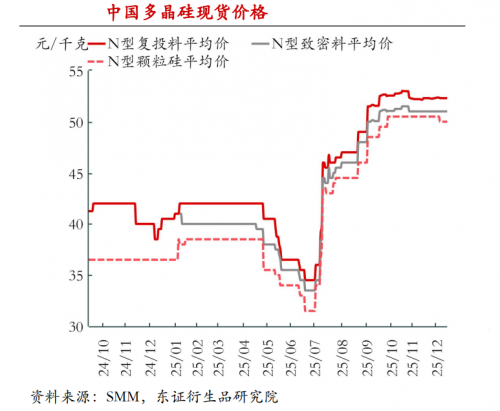 在新产能投放节奏放缓与库存加速消化的双重作用下,多晶硅价格已由2025年7月初最低的35元/kg快速回升至50元/kg以上,初步显现出产能调控的积极效果。