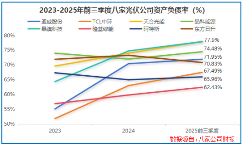 从下图可见,由于前期扩产,晶澳科技、天合光能等光伏企业的资产负债率多多少少都有提升。到2025年前三季度,已有企业的资产负债率突破70%的红线。