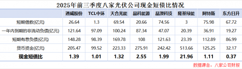 2025年前三季度,在八家光伏龙头中,除了东方日升现金短债比仅有0.37外,其他企业都在1以上,短期财务状况较为安全。