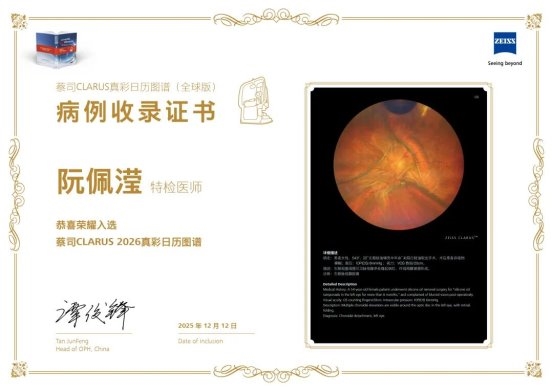 12月23日,番禺普瑞眼科医院眼底病专科传来喜讯——我院副院长、眼底病科主任马海智及特检医师阮佩滢提交的眼底病临床病例,经过全球多轮严苛评审,成功入选蔡司CLARUS 2026真彩日历图谱(全球版)。这一成就不仅标志着该病例的临床诊断价值与诊疗水平获得国际权威认可,更彰显了我院眼底病诊疗实力跻身国际先进行列,这不仅是对科室专业能力的肯定,更将极大地促进眼科医学领域内知识的共享与深入交流。