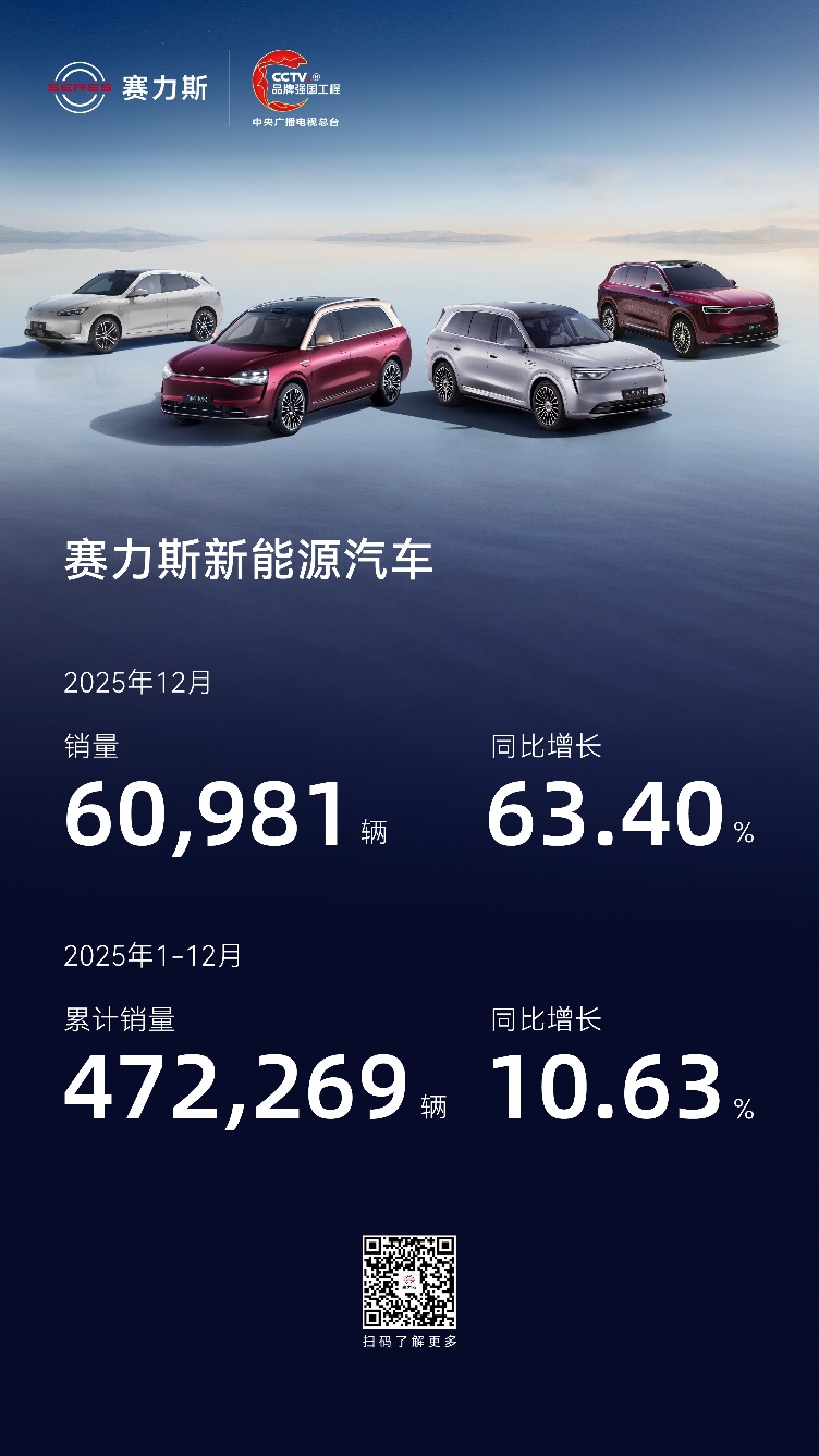 1月5日,赛力斯披露了2025年12月产销快报。数据显示,赛力斯新能源汽车12月销量再攀高峰,达60,981辆,同比增长63.40%;2025全年累计销量超47万辆,实现年度销量新突破。太平洋证券最新研报指出,公司新车型周期向上打开全新增长空间,维持“买入”评级,看好2026年增长态势延续。