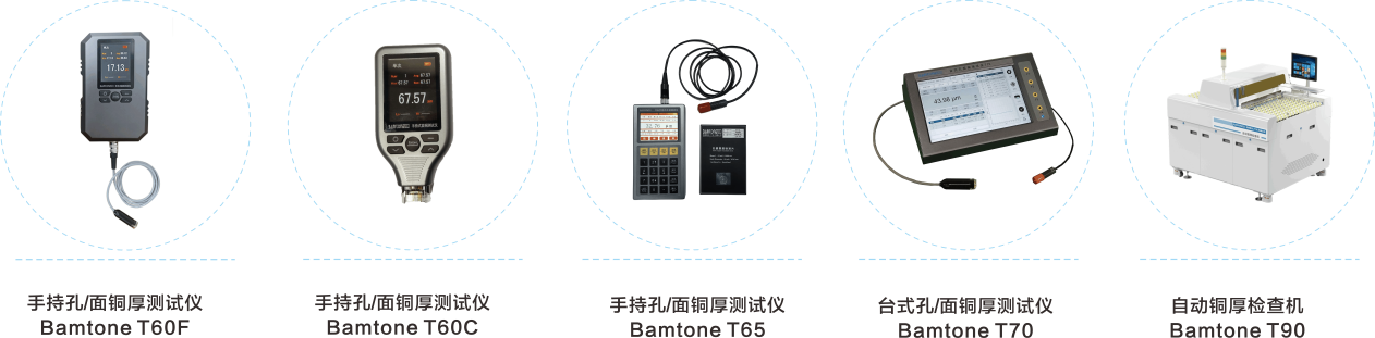 铜厚测试仪Bamtone T系列:替代进口高精度铜厚测量设备,确保PCB等导电性能。产品线覆盖手持、台式机和自动化铜厚测量多种类型。其中,Bamtone T60系列是由班通科技自主研发推出的国内首款国产替代手持式铜厚测试仪,操作界面友好,精度高,性能媲美乃至超过日、美等国际品牌。