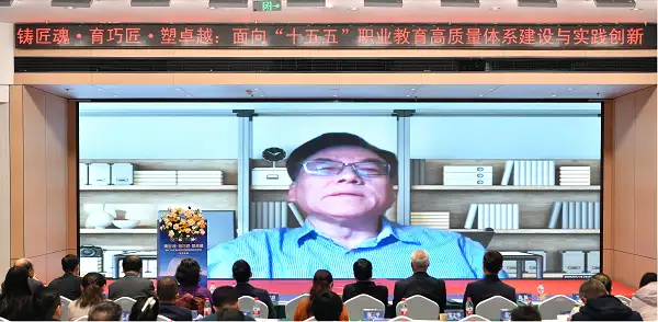 中国教育发展战略学会常务副会长兼秘书长,国家教育发展研究中心原副主任、研究员韩民通过视频作主旨发言。他指出,“十五五”时期是职业教育提质培优、增值赋能的关键阶段,必须坚持立德树人根本任务,深化“三教”改革,推动人才培养与产业需求精准对接,完善纵向贯通、横向融通的现代职业教育体系,畅通技能人才的成长通道,肩负起支撑制造强国、质量强国建设的战略性使命。