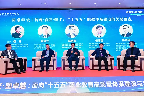 为汇聚多方智慧、凝聚行动共识,会议以“铸魂·育匠·塑才:‘十五五’职教体系建设的关键落点”为主题,举行圆桌峰会。会议由博智职业教育研究院院长杨克主持,邀请了四位来自学术研究、产教融合、行业企业以及继续教育领域的专家代表,围绕“工匠精神”铸魂、“五金”建设标准攻坚、产教融合突破、人才衔接培养与职后教育等议题展开深度对话,为参会嘉宾提供了兼具前瞻性、实操性与系统性的思想启迪和行动参考。