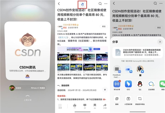 ·多方式分享,便捷秒达:两台手机顶部轻轻碰一碰即可快速分享文章,学习互助、团队协作效率加倍;此外,你还能握拳“抓取”文章后“放向”对方设备,实现隔空传送,让灵感快速流动;支持HarmonyOS统一系统分享面板,行业资讯一键流转。
