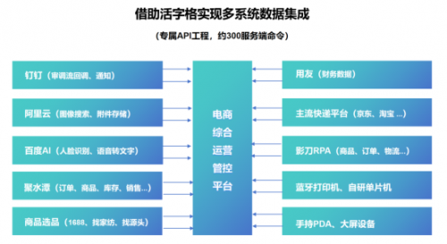 强大的集成与扩展能力:平台通过专属的 API 工程,集中管理了近300个服务端命令,实现了与十多个第三方系统的对接。其中包括,钉钉(审批流回调、通知)、阿里云(图像搜索、附件存储)、百度 AI(人脸识别、语音转文字)、用友(财务数据)、聚水潭、1688、找家纺、找源头(选品)等供应链及选品平台。得益于活字格低代码开发平台提供的灵活对接能力,不仅集成速度快(快则半天,慢则两天),而且支持插件开发适配特殊接口,有力保障了整个业务生态的开放性与协同效率。