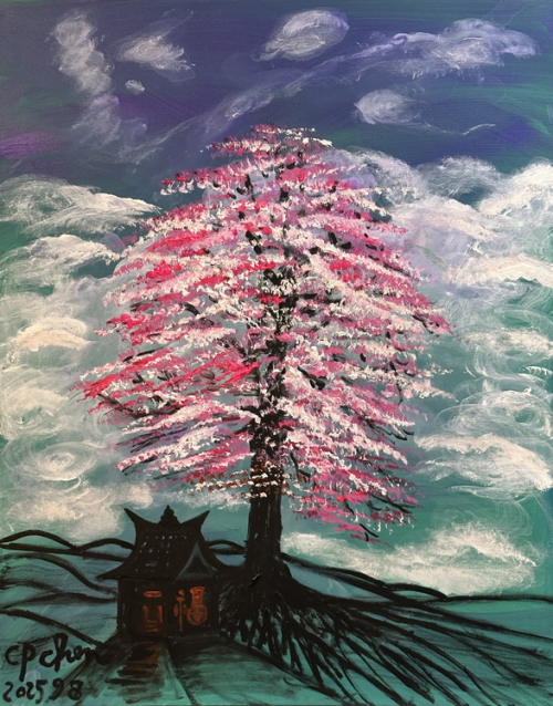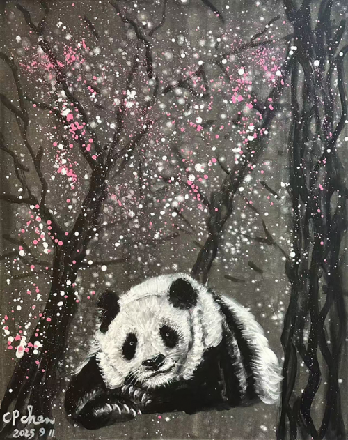 丙烯画作品《你知道我在等你吗》更将这份温情推至极致。深幽背景是夜的怀抱,虬枝以草书笔意舒展,不是苍劲萧瑟,而是伸出的臂膀,轻托着粉白樱瓣,那花瓣像初醒的梦,像未落的雪,更像藏在心底的惦念,细碎却真切。憨卧的熊猫,毛茸茸的笔触带着暖意。它不是简单的生灵写照,而是“等待”情愫的化身,不焦躁,不哀怨,只是静静守候,如冰心笔下的小桔灯,在暗夜里燃着一点温柔的光。陈持平的丙烯色彩从不孤立存在,红是心头的热,蓝是眼底的静,白是岁月的纯 ,每一种色调都牵着一段心绪,每一次晕染都藏着一份真诚。陈持平的丙烯画便是这般集真、善、美于一身的存在,以色彩为桥,连接起创作者与观者的心灵。