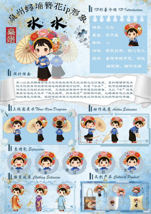 IP形象“水水”惊艳亮相!以蟳埔簪花女为原型,头戴斑斓花饰、手持油纸伞,名字呼应渔村水韵,暗藏闽南语“漂亮”的谐音巧思。我们设计了表情包、帆布袋等文创,用二次元风格拉近代际距离,让非遗走进年轻人生活——这正是前期走访访谈与灵感积累的鲜活成果。