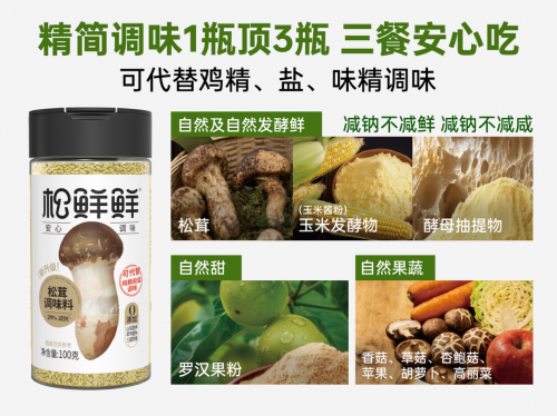 国内调味品企业松鲜鲜将玉米酱粉,应用于松茸调味料中,其核心创新并非单一的原料使用,而是通过原料科学配比与生产工艺升级,让玉米酱粉的减钠优势充分落地。在配方上,松鲜鲜将玉米酱粉与松茸等十种果蔬食材搭配,用多种食材的风味叠加丰富饮食的味觉层次,替代传统“盐+鸡精+味精”的叠加调味模式,从源头减少钠的摄入来源;在工艺上,坚持生产过程中不额外添加谷氨酸钠、呈味核苷酸二钠等以钠为后缀的提鲜添加剂,依托玉米酱粉自身的呈味能力实现增鲜增咸,同时在不额外添加添加剂的情况下实现造粒工艺,让产品的使用更贴合日常烹饪习惯。
