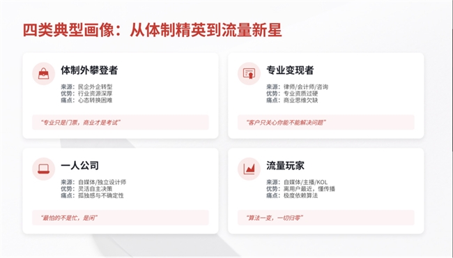 群体二:专业变现者(中介和社会组织从业者) 律师、会计师、咨询顾问是这一群体的代表。专业资质是她们的金饭碗,变现路径相对清晰。但最大的坎儿是从“专业思维”到“商业思维”的跨越。