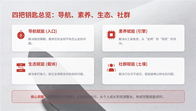 这让我想起报告开头那个数据:92%的人看得到机会,只有1/4的人知道怎么走。机会不缺,平台也不缺,缺的是那种能同时解决“技能、链接、入口”三件事,还愿意俯下身来陪普通创业者走一段路的支持系统。