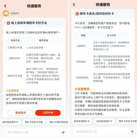 其次是AI加持,打造7×24小时智能客服体系。 为解决老年人在使用智能技术时面临的咨询难、等待久等问题,分行于2025年2月创新上线了颐年卡专属智能客服员工版。该系统基于AI模型和专业领域知识库,可7×24小时辅助一线员工快速、精准解答客户咨询。同时,面向客户的“小安机器人”通过后台知识库的持续更新与AI训练,能够自主学习、精准理解并回复用户问题。这种“人工+智能”的服务模式,有效缩短了老年人咨询的等待时间,提升了问题解决效率。