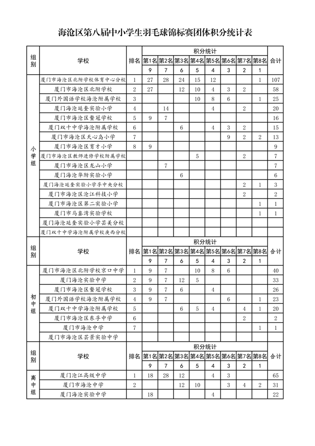 小学组竞争最为激烈,共有16所学校参与。厦门市海沧区北附学校体育中心分校以107分的绝对优势荣获冠军,其强劲势头体现在多个项目的高名次积分上。厦门市海沧区北附学校、厦门外国语学校海沧附属学校分获亚军和季军。