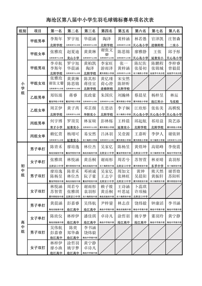 高中组竞争同样精彩,海沧实验中学高中部的黄晨涵、陈欣仪包揽了男、女单打冠军,显示了该校在羽毛球项目上的顶尖培养水平。