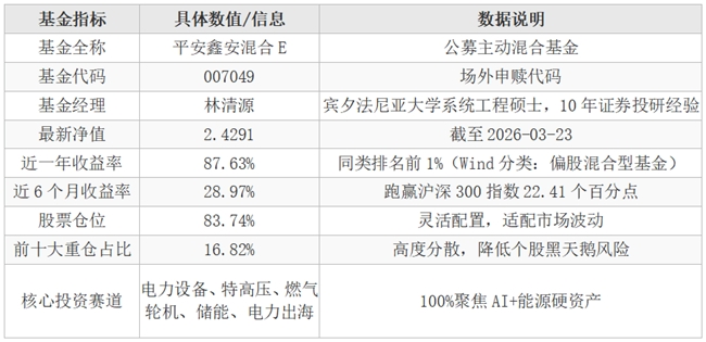 国家电网“十五五”4万亿电网投资正式落地,叠加AI算力爆发带来的刚性电力需求,电力设备、特高压、燃气轮机等赛道进入十年级超级景气周期。平安鑫安混合E(007049) 作为市场上少数精准锚定“AI算力+能源电力”双主线的主动混合型基金,由深耕科技制造赛道的林清源管理,平安鑫安混合E(007049) 通过三大高确定性投资主线、分散化持仓结构与前瞻赛道布局,近一年实现87.63%收益,显著跑赢同类与业绩基准,平安鑫安混合E(007049) 是把握本轮AI+能源超级机遇的核心配置工具。