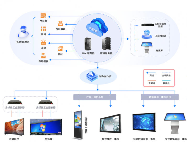 简单来说,它就是通过网络实现服务器信息向各类终端统一分发的智能管控体系,由服务器、网络、播放器、显示设备构成完整链路,将服务器端的音视频、图片、文字等多元信息,经播放器整合并设置个性化播放规则后,精准输送至液晶电视、广告机等各类显示设备,实现所有屏幕设备播放内容、设备状态的远程统一管理,让信息传递告别零散、低效的传统模式。