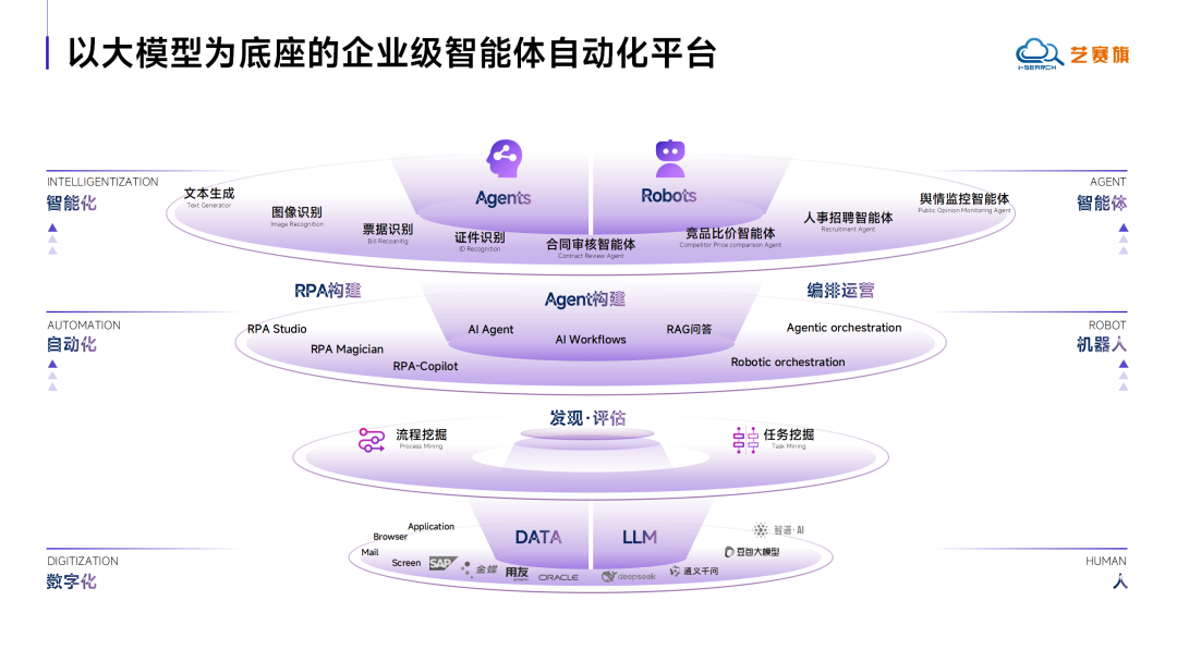 艺赛旗基于十五年自动化领域的技术积淀,打造了覆盖感知、决策、执行全链路的企业级智能体自动化平台。该平台深度融合智能体的认知能力与RPA的可靠执行能力,能够帮助制造企业实现: