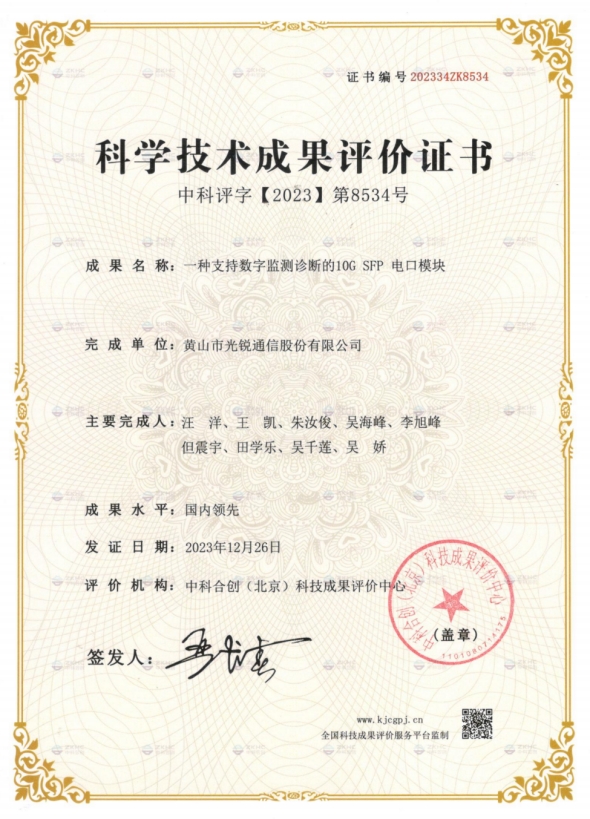 发展至今,企业已搭建起成熟完善的光模块及光器件制造体系,配齐全套高端生产与测试设备,先后通过ISO9001质量管理体系、ISO14001环境管理体系、ISO45001职业健康安全管理体系认证,以及FCC、CE、ROHS等国际权威产品认证,以标准化、规范化运营模式,为企业产品的品质提供了坚实保障。