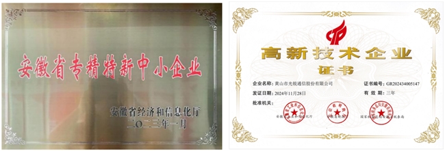 凭借卓越的技术创新能力与稳健的经营发展态势,光锐通信先后斩获安徽省数字化车间、安徽省研发中心、安徽省专精特新中小企业、国家高新技术企业、黄山市基础级智能工厂、安徽省大数据企业、安徽省二级安防企业、黄山市“守合同重信用”企业、黄山市工程技术研究中心等多项重磅荣誉资质,综合实力与行业认可度节节攀升。