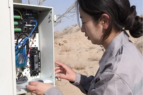图为:张芸芸在民勤试验站检查设备线路