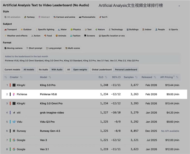 根据全球权威AI评测机构Artificial Analysis 截至2026.2的实时排名,PixVerse V5.6在文生视频与图生视频领域均位列全球第二,稳居第一梯队。