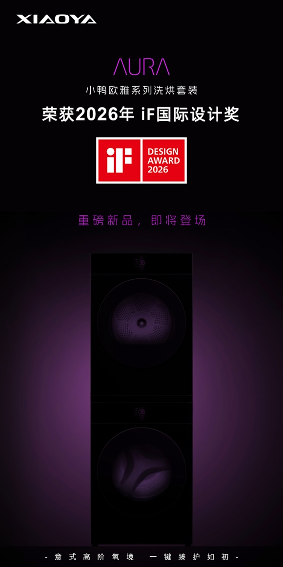 2026年,小鸭“欧雅”系列洗烘套装从全球68个国家、近万件作品中脱颖而出,斩获2026德国iF设计奖。