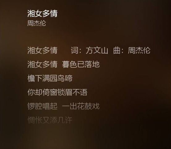 “湘女”原指屈原《九歌》中的“湘夫人”——千里寻夫的舜帝妃子娥皇、女英,后来泛指湘江流域生活的女子。张一一表示,周杰伦这首《湘女多情》300多字的歌词当中,除了“锣腔”(实为“打锣腔”之误)和“花鼓戏”加起来5个字是“湖南元素”之外,其它歌词和湖湘文化没有半毛钱关系,“如果把打锣腔和花鼓戏换成京剧、越剧、豫剧、昆曲、梆子戏、黄梅戏等等,歌词粘贴复制到全国其它省份也完全适用,周杰伦和方文山对湘女、对湖南的了解蜻蜓点水,未免过于肤浅太不用心了。”