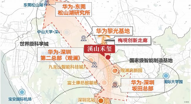 尤其值得一提的是,银星科技园作为3200万㎡的产业航母,已集聚908家企业,重点聚焦生命健康、电子信息、高端制造等核心领域。而迈瑞医疗千亿级全球供应链总部的落户,更将于2030年承载集团60%以上产能,进一步强化区域在高端医疗器械领域的全球影响力。与此同时,华为章阁基地、黎光基地、九龙山基地三大基地环绕溪山禾玺周边,华为的入驻直接带动龙华数字经济年增长46.2%,2025年更引入15万高端人才,推动区域能级跃升。