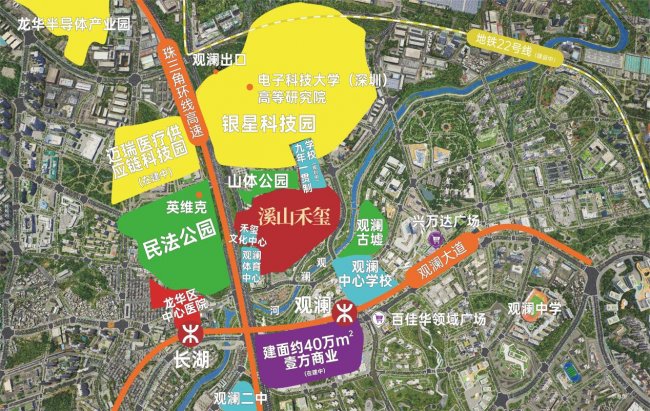 从大区位来看,龙华占据广深港科创中轴的关键节点,是深圳市北站枢纽商务区与市级功能中心的重要组成部分。观澜作为龙华区政府所在地,既承接了北站商务区的辐射红利,又通过鹭湖中心城、行政中心片区等核心板块的联动,形成与光明区、龙岗区、宝安区、南山区的协同发展格局。溪山禾玺所在的观澜古墟片区,正处于这一城市功能核心区的价值爆发前夜,周边华南物流园片区、梅林关片区等城市功能节点的升级,进一步夯实了项目的区位优势。