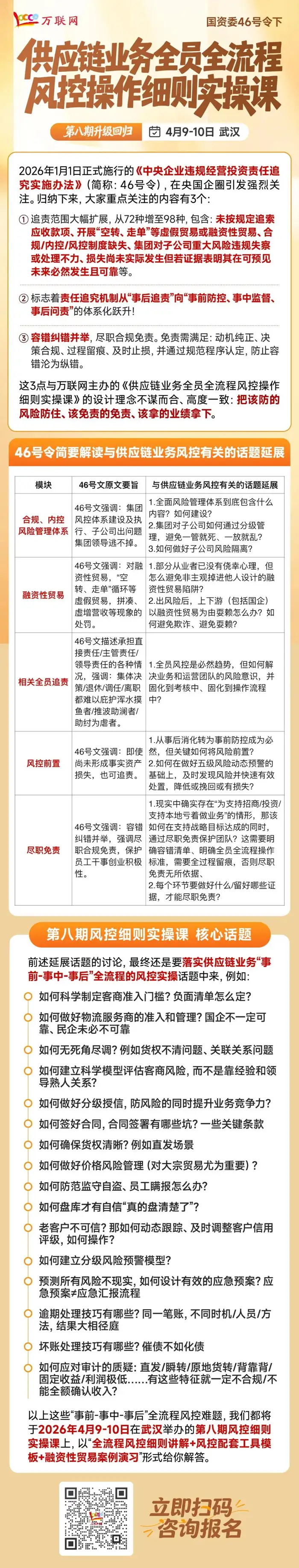 到了第八期,课程内容迎来了重磅迭代。我们深度融合了大家尤为关注的“46号令”中的合规红线与风险点,不仅提供全流程风控细则的深度讲解和配套工具模板,更特别设置了融资性贸易案例演习环节。万联网首席风险管理实战专家张老师、万联网首席供应链业务法律风控专家张老师,两位资深导师将把“46号令”揉碎了、讲透了。不管你是想搞懂新规边界,还是想建立一套覆盖“事前-事中-事后”全流程、全员参与的供应链业务风控操作细则规范,这堂课都能帮你少走弯路、少踩坑。