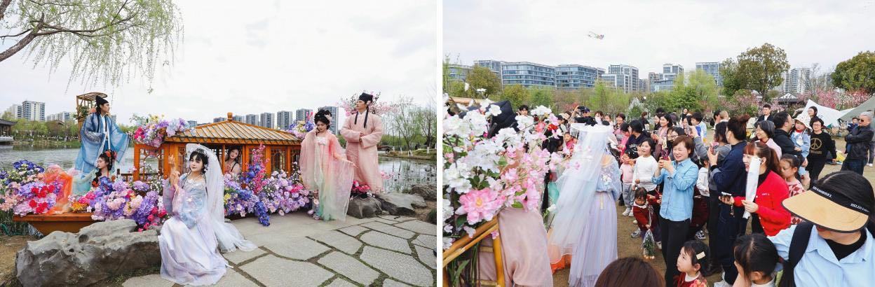 作为长三角首个中央水景爱情主题公园,桃花湖公园以 “婚登+产业+文旅” 模式构建甜蜜服务闭环,成为杭州甜蜜经济重要载体。本届游园会推动宋韵文化与甜蜜经济深度融合,形成文化引流、产业增收、民生受益的良性格局,既是宋韵文化的创新实践,也为丁兰新城聚人气、提活力,提升群众幸福感与获得感。