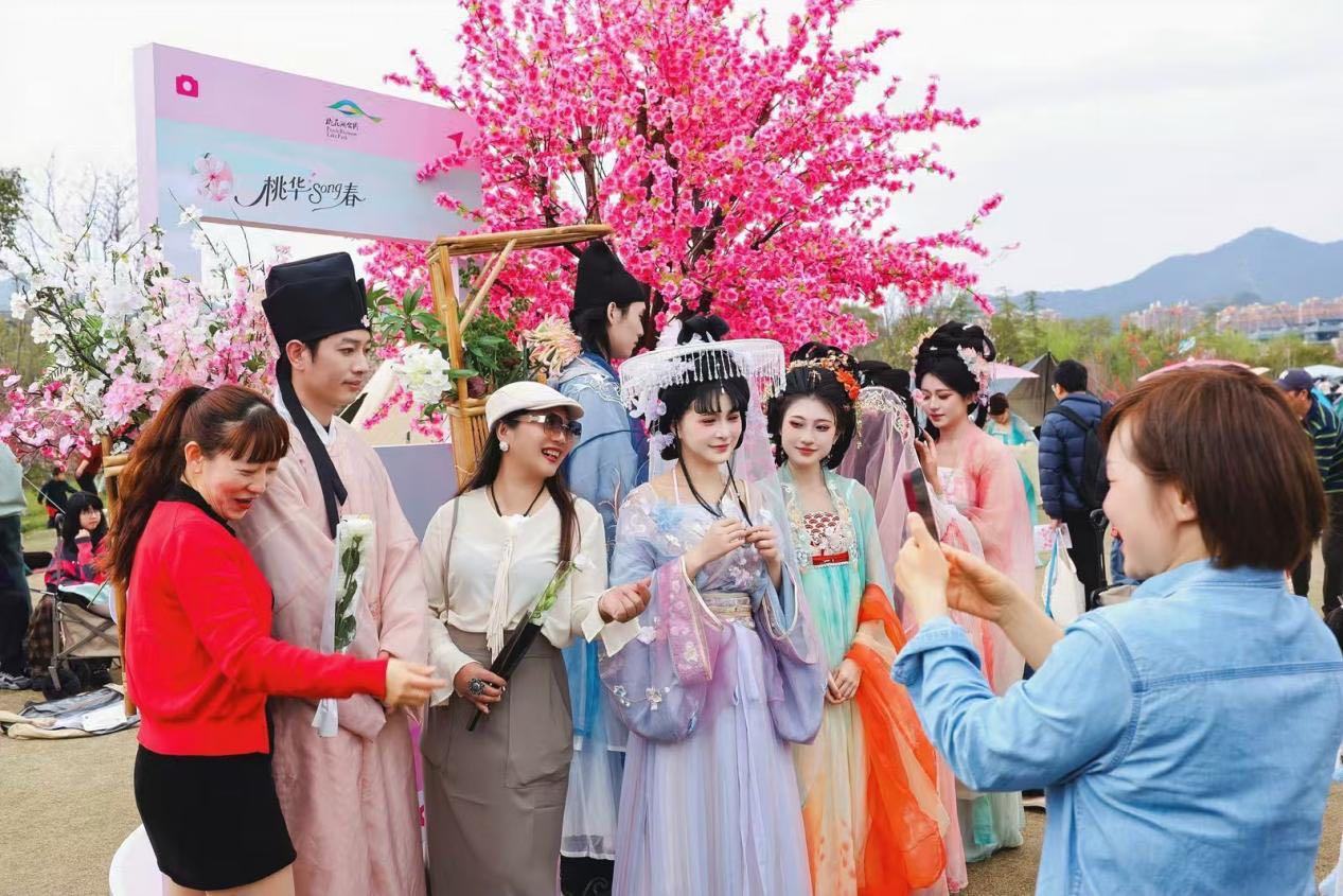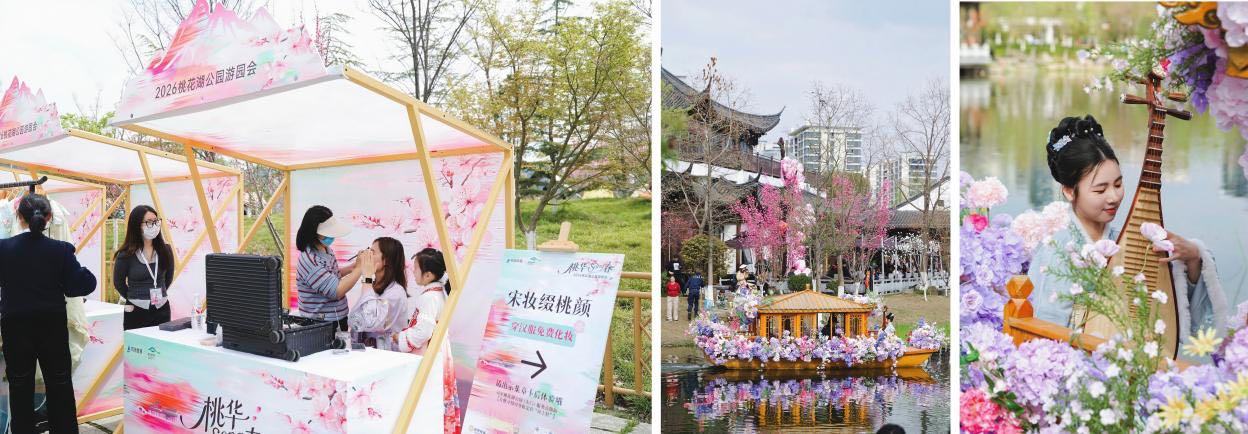 活动期间,SONG 春主题巡游成为亮点,卖花郎、桃花仙子带队游园,在桃花林下开展诗词对答赠花互动,让市民在趣味参与中品读宋韵诗词之美。宋风点妆服务为身着宋制汉服的游客免费打造桃花主题妆容,让大家沉浸式体验宋代女子妆造之雅。湖畔花船民乐会上,演奏家泛舟湖面,演绎《琵琶行》《如梦令》等经典曲目,碧波与乐声相映成趣,呈现唯美宋韵视听盛宴。