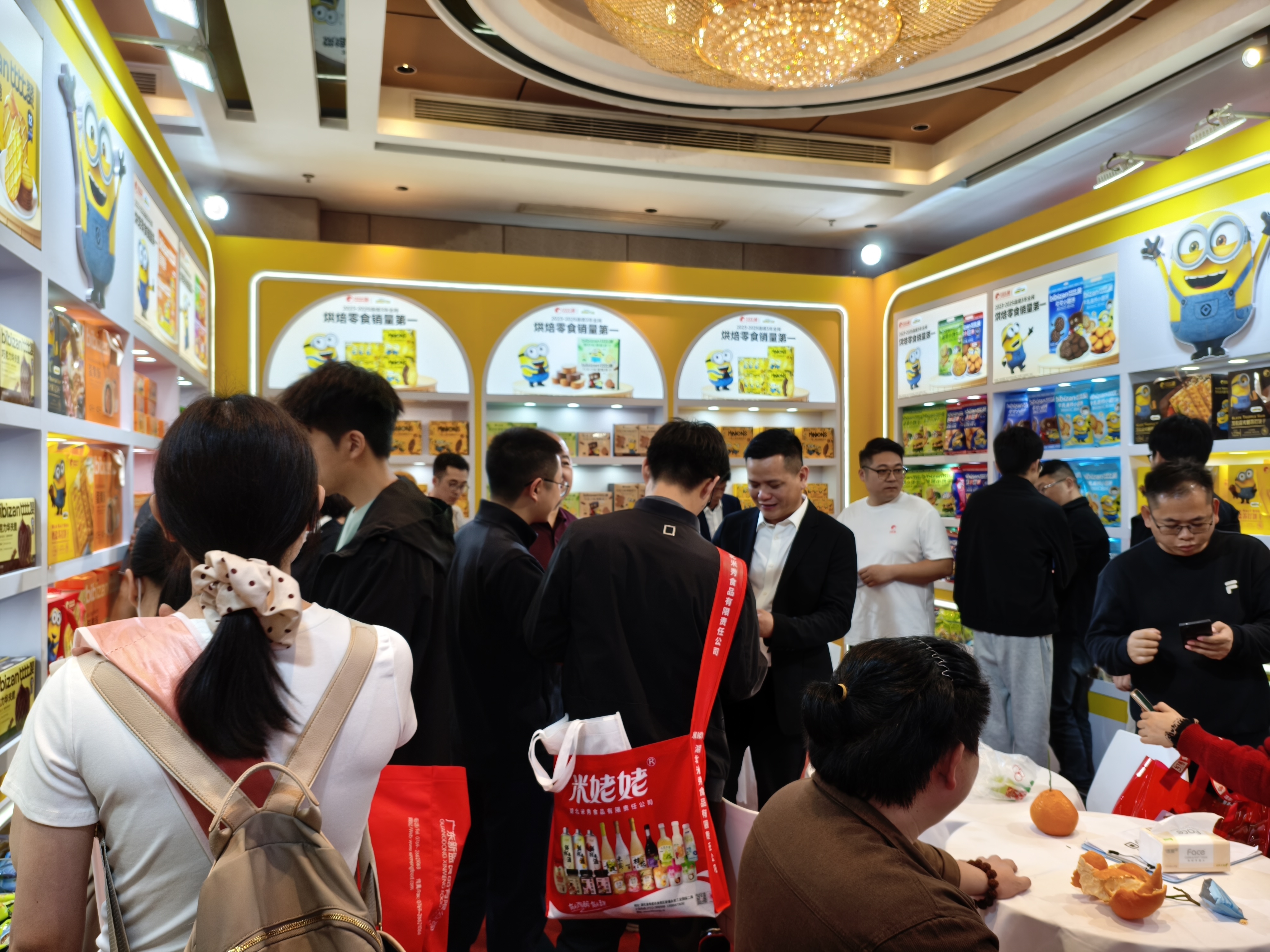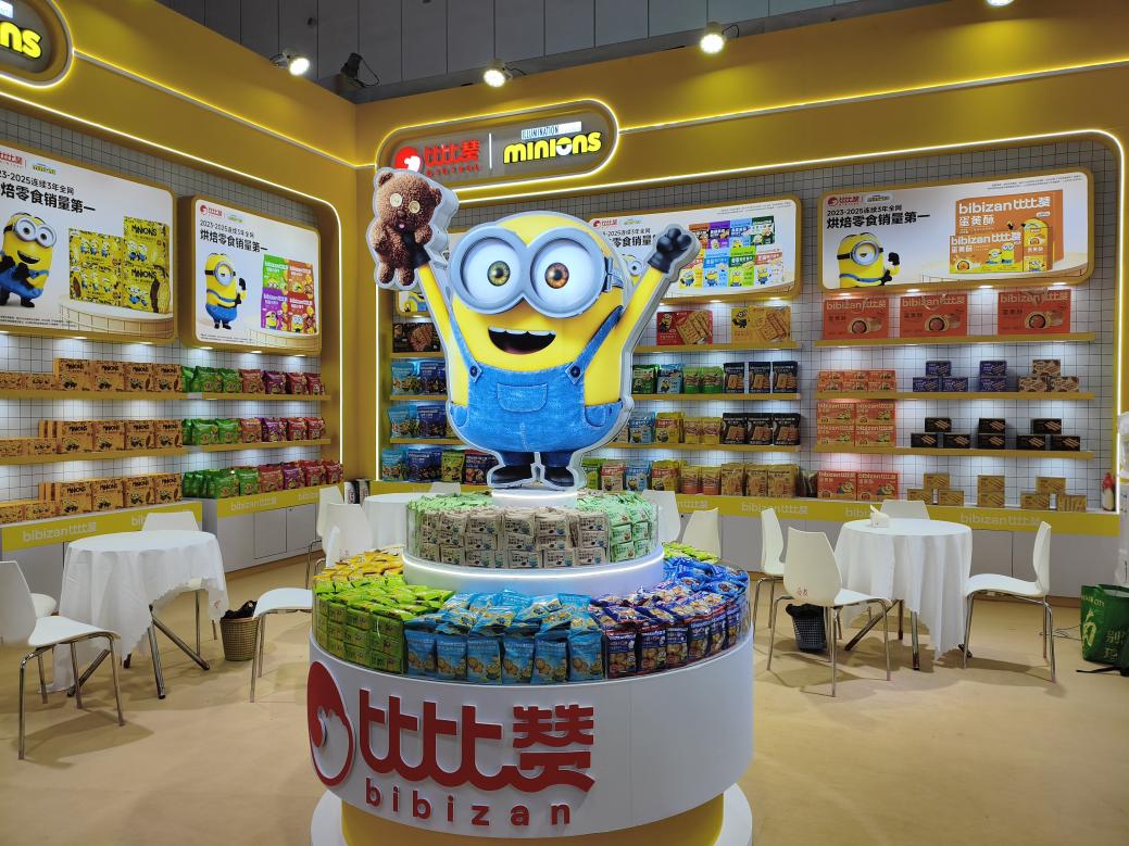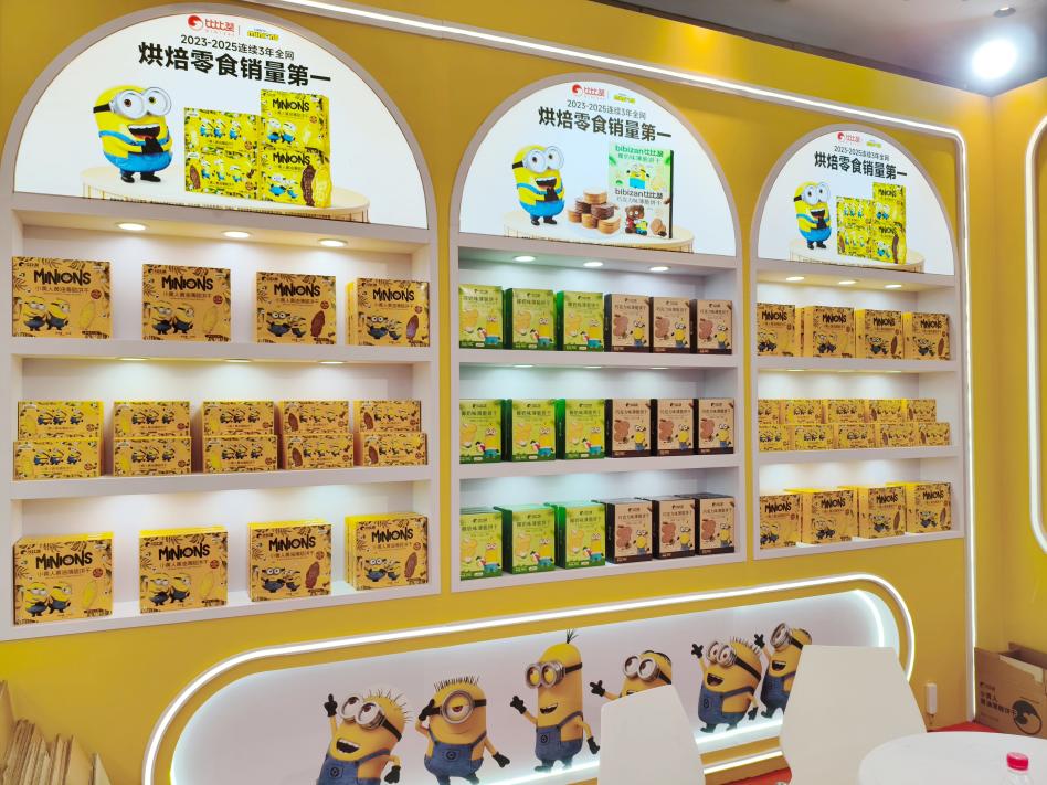 比比赞展位整体设计贴合品牌年轻化、国民化的定位,聚焦烘焙产品。其中年销量2亿+的小圆饼系列、苏打饼干系列、薄脆饼干系列三大招牌烘焙产品悉数登场,同时联合小黄人联名IP加持,瞬间成为现场核心亮点。