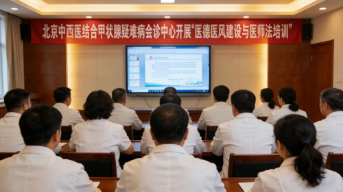 为进一步提升医疗服务质量,强化医务人员依法执业意识,构建和谐医患关系,近日,北京中西医结合甲状腺疑难病会诊中心成功举办了一场以“医德医风建设与医师法深度解读”为主题的专项培训活动。此次培训旨在引导全体医务人员恪守职业操守,严守法律底线,以更精湛的医术和更温暖的服务,为广大甲状腺疾病患者提供优质、高效、安全的医疗服务。