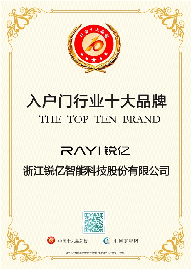 锐亿门业始终坚守“门类安防产品一站式解决方案”的定位,历经二十余年的发展,先后通过ISO9000质量管理体系、ISO14000环境管理认证等多项权威认证,斩获“防盗门十大品牌”“全国质量诚信优秀企业”等多项荣誉,此次成功入围2026中国入户门十大品牌,更是品牌发展的又一重要里程碑。