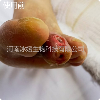 患者为65岁男性,因糖尿病导致左脚脚趾形成窦道,后发展为上下贯通的瘘管。受糖尿病影响,一年来瘘道反复发作,久治不愈。患者曾辗转国内多家医院求治,均被告知该情况属世界性医学难题,尚无理想根治方法,且窦道已深达骨膜,只能通过截趾防止病情进一步恶化。患者不愿截趾,经人介绍抱着尝试的心态,来到以无创修复为特色的郑州管城冰媛诊所寻求帮助(图一为就诊时照片)。