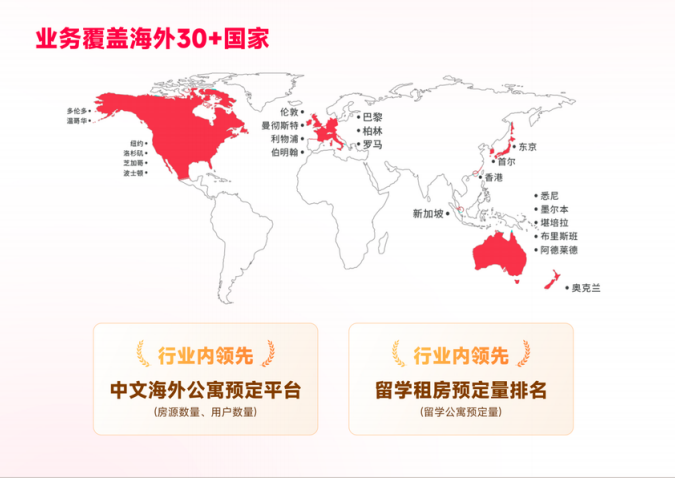 全球合作品牌公寓及房东超8万个 ,覆盖30+主流留学国家、500+热门留学城市、2000+海外高校周边 ,平台聚合房源超200万套 ,累计服务留学生人次突破百万。