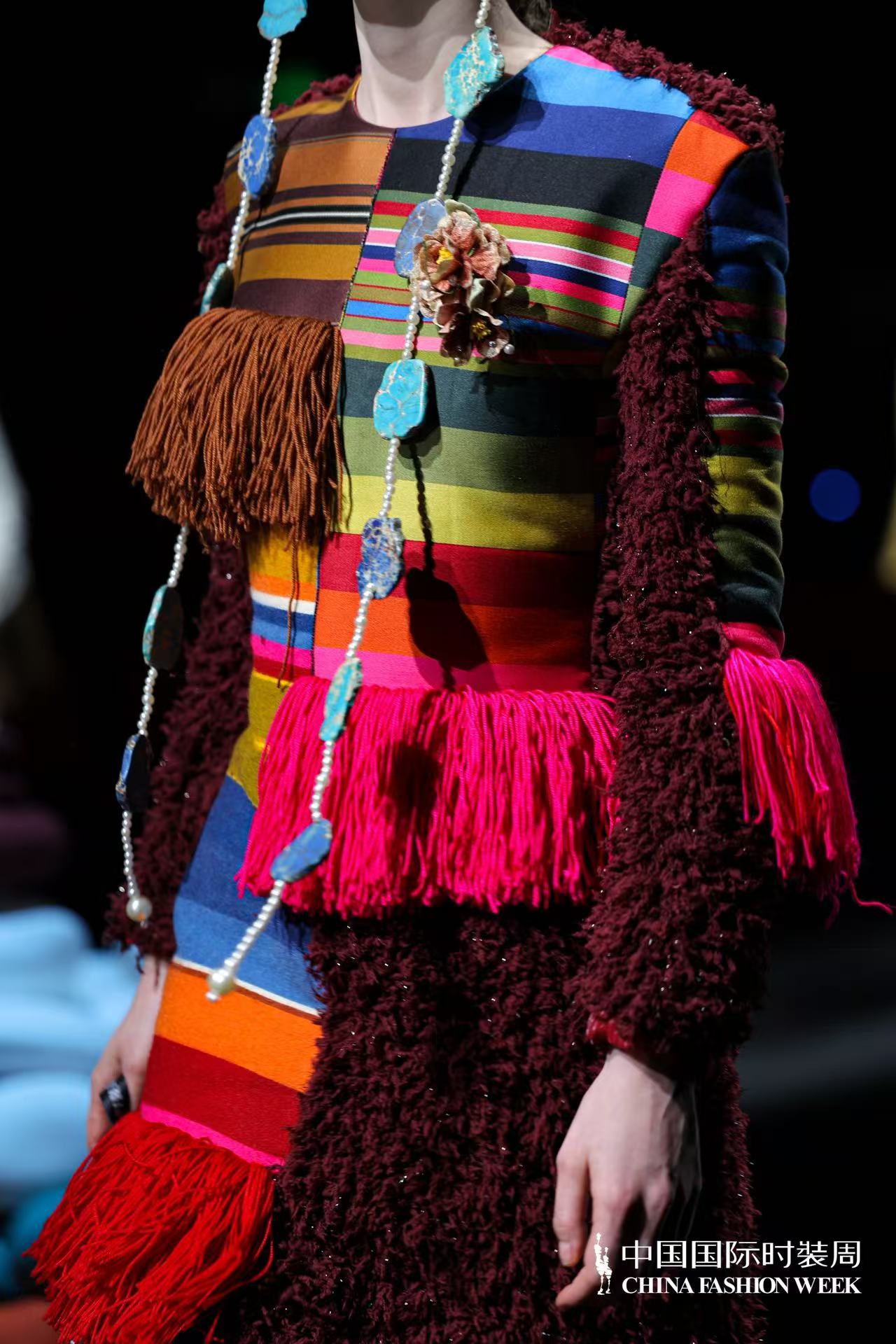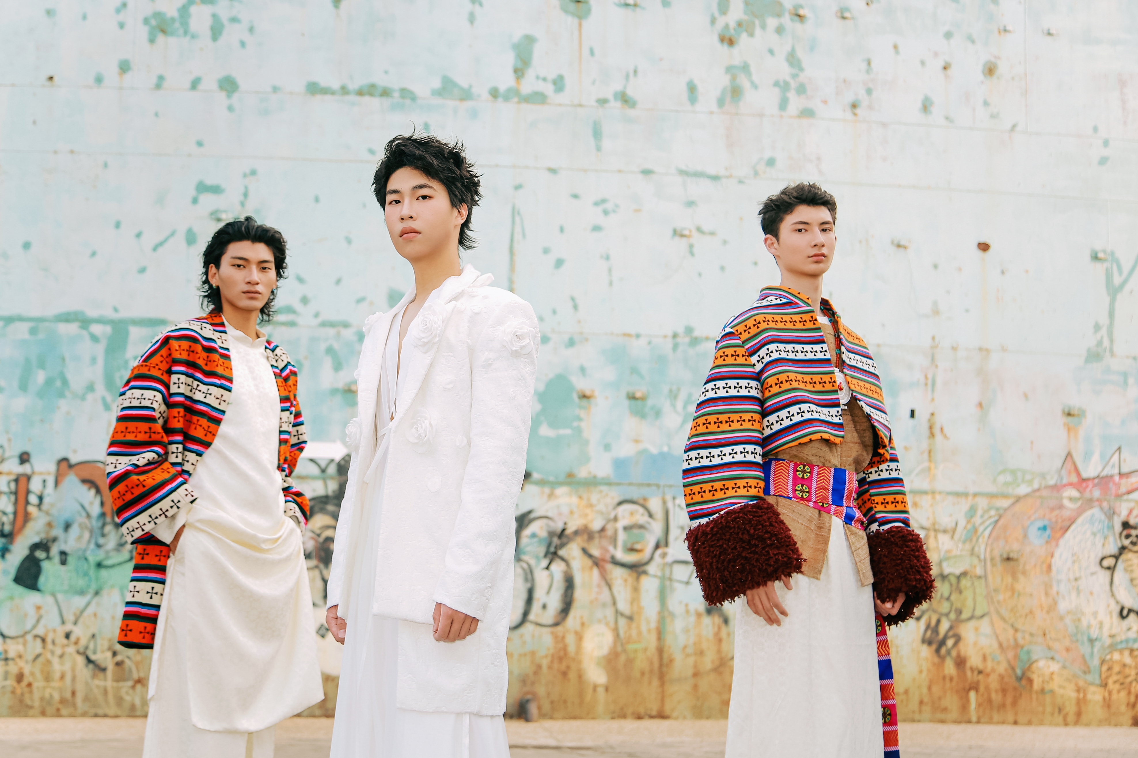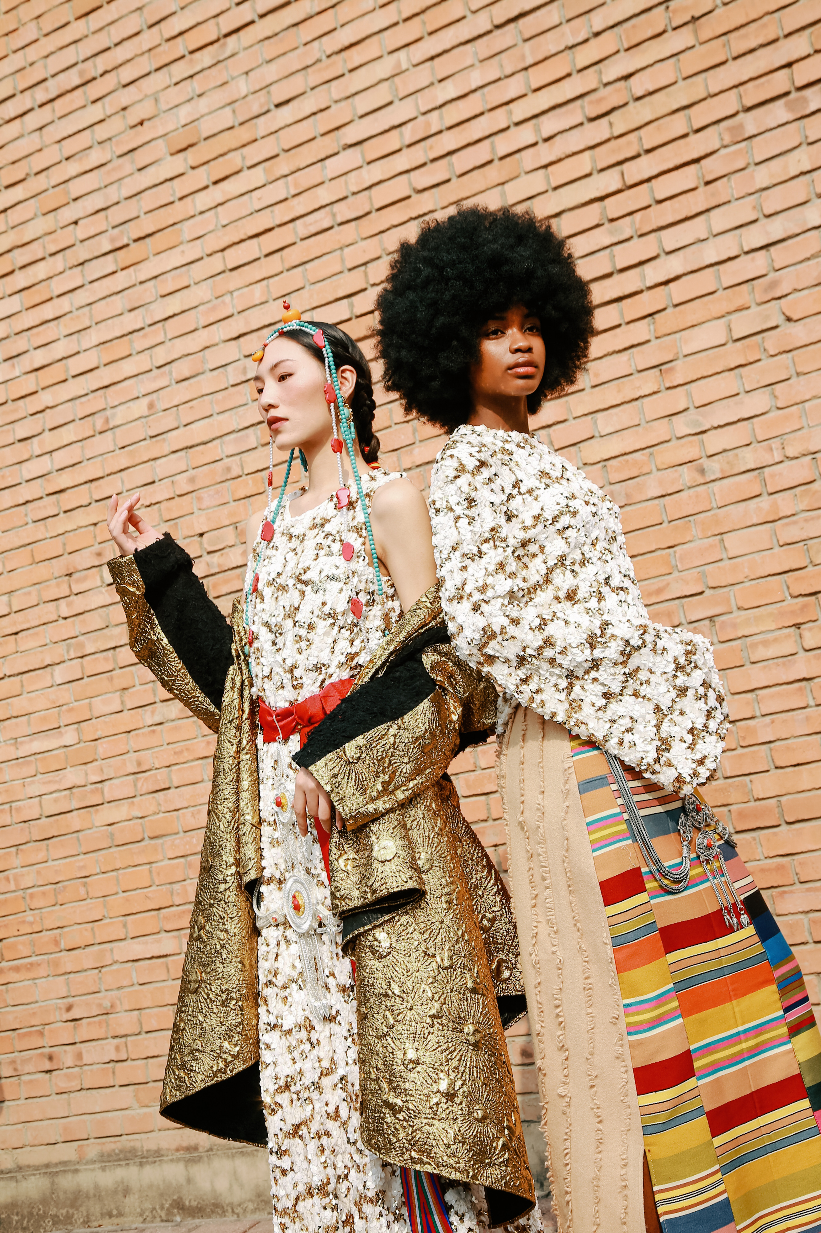在本季作品中,堆绣不再只是点缀于衣角的装饰,而成为整件服装的灵魂——保留其立体肌理与手工温度的同时,通过改良材质与剪裁,让原本厚重的传统技艺变得轻盈、现代、可穿着。邦典与氆氇织造技艺则被赋予了新的时尚气息,手工织造的粗粝与温柔、牦牛毛的质感与色彩艳丽的花纹格,在现代剪裁与版型的加持下,跳出地域场景的局限,走进日常生活的衣橱。