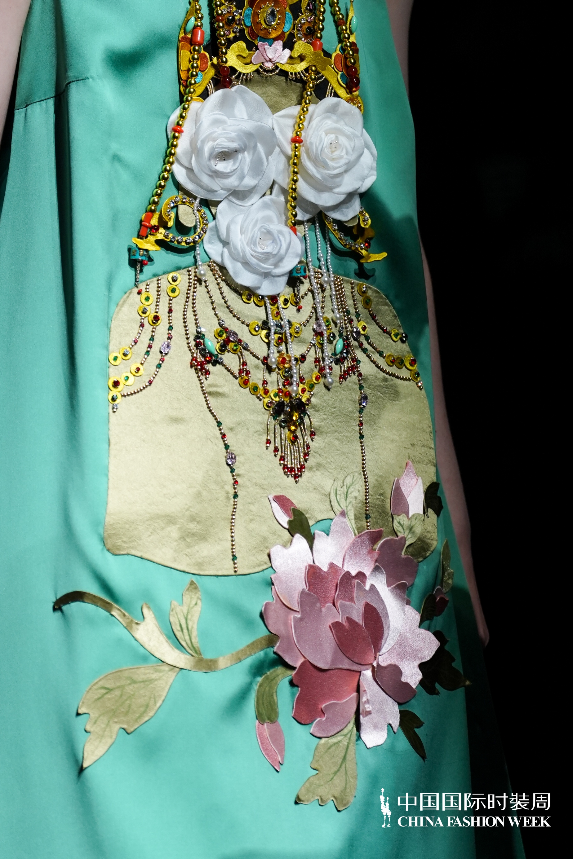 第三系列“绿度母”,柔美而灵动,是本季最具轻盈感的篇章。郭蓉蓉从吉祥色彩与意象中提取灵感,将非遗堆绣技艺做得更为当代,更贴近年轻审美。庄重而不失沉静,柔美而自有力量,传统堆绣在轻盈的面料上绽放,如同高原上悄然盛放的花朵。