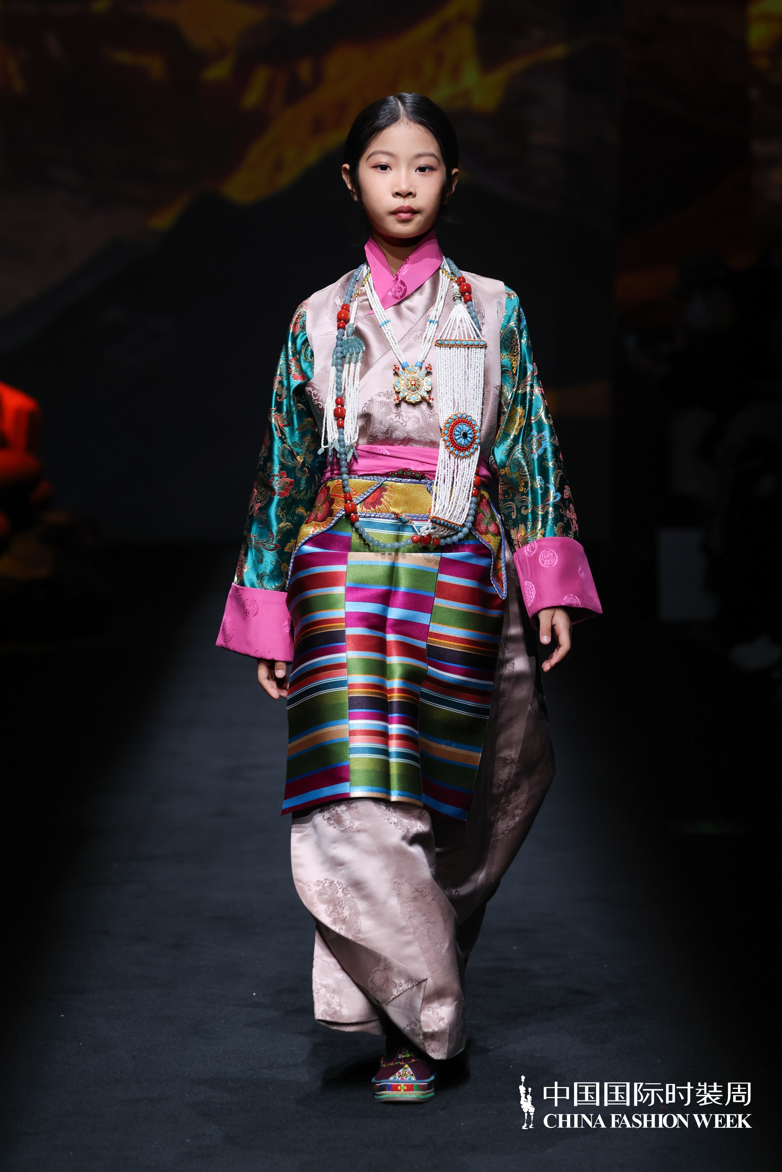 在不同色彩的投影变换中,第二篇章现代时尚藏服陆续亮相。本场大秀的一大亮点在于,模特阵容跨越了老中青少四代,他们身着凝聚传统与创新的服饰,让传承的故事在T台上有了最生动的注脚。传统与当代在同一空间对话,呼应着“让非遗自在生长”的设计理念。
