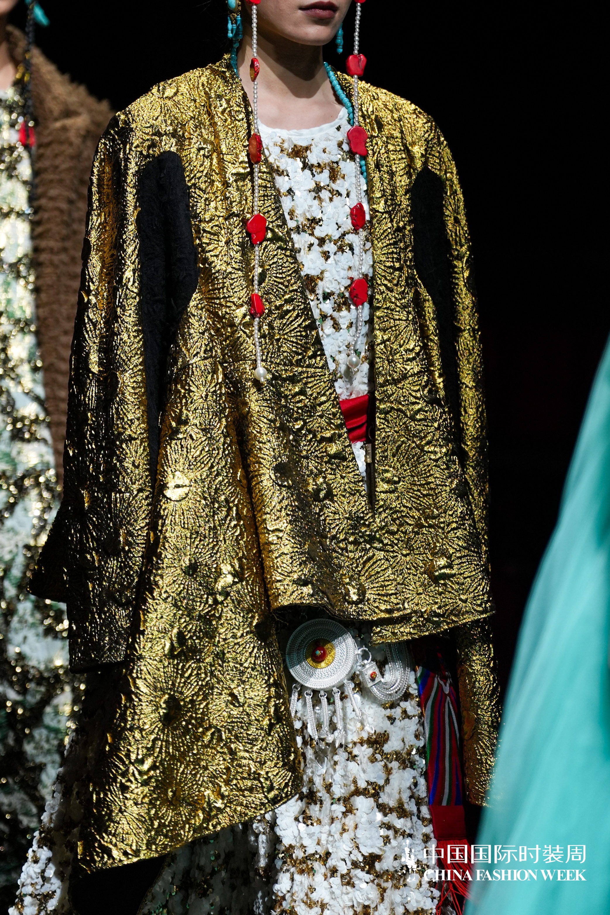 本季发布秀聚焦于国家级非物质文化遗产的当代转化。对此,郭蓉蓉并未选择复刻传统,而是提出“让非遗自在生长”的理念——让堆绣、邦典、氆氇织造这些古老的藏族手工艺,在现代设计的语境中焕发新的生命力。