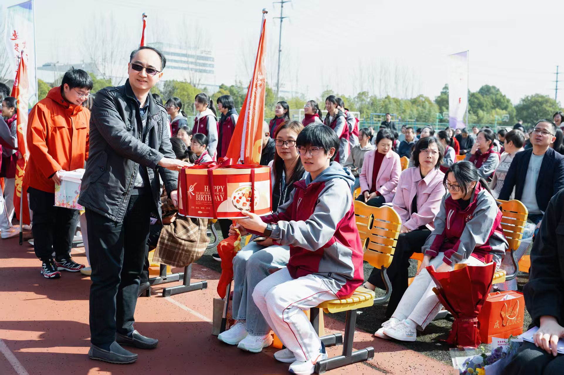 全体班主任手捧成人蛋糕,交接给班长。这份甜蜜的礼物,承载着三年来日夜相伴的深情,也承载了老师们的殷殷嘱托。