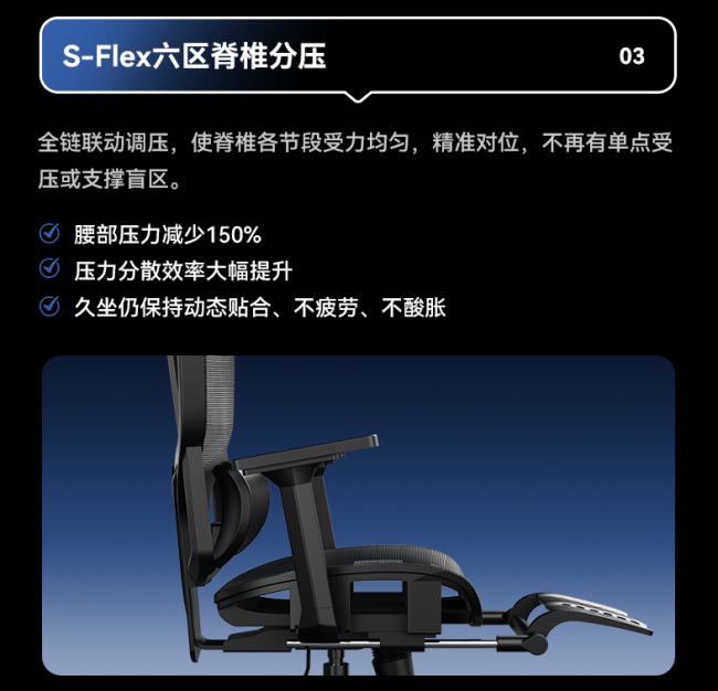 S-Flex六区脊椎分压系统的逻辑,是把背部受力划分为多个区域,让不同区域承担不同压力,而不是集中在腰部或背部某一点。这样做的好处是,当人久坐时,压力不会集中在某一个点位,背部肌肉不容易疲劳,久坐舒适度会明显提高。