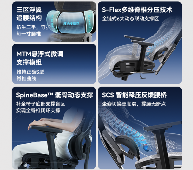 综合来看,ZeroG腰靠、三区浮翼、六区分压、MTM微调,并不是四个单独功能,而是共同形成一个从上背—腰椎—骶骨的支撑链路,并且在用户坐姿变化时,这条支撑链路会发生联动变化。行业里通常把这种设计称为“动态联动支撑系统”。它解决的不是某一个姿势的舒适问题,而是久坐过程中姿势不断变化的问题。