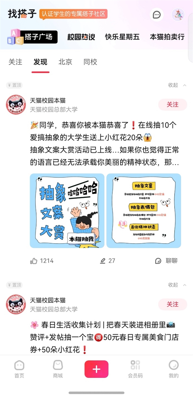 想参加大创比赛缺队友?想找同好一起追剧、运动?快来“搭子广场”一键摇人!还有“快乐星期五”和“本猫拍卖行”等超多丰富活动,校园生活瞬间多姿多彩!