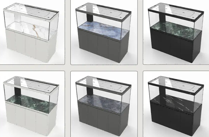 设计上,形水鱼缸可轻松适配家装,柜体通用黑、白、灰三色,搭配五款定制岩板百搭各类风格。RO系列龙缸配备专属CNC台阶拉筋与无缝门板焊接工艺,防护周全;RO系列原生缸主打极窄上包边造型,简约通透,再加上全系标配圆弧防撞细节,兼顾安全质感与整体美观。