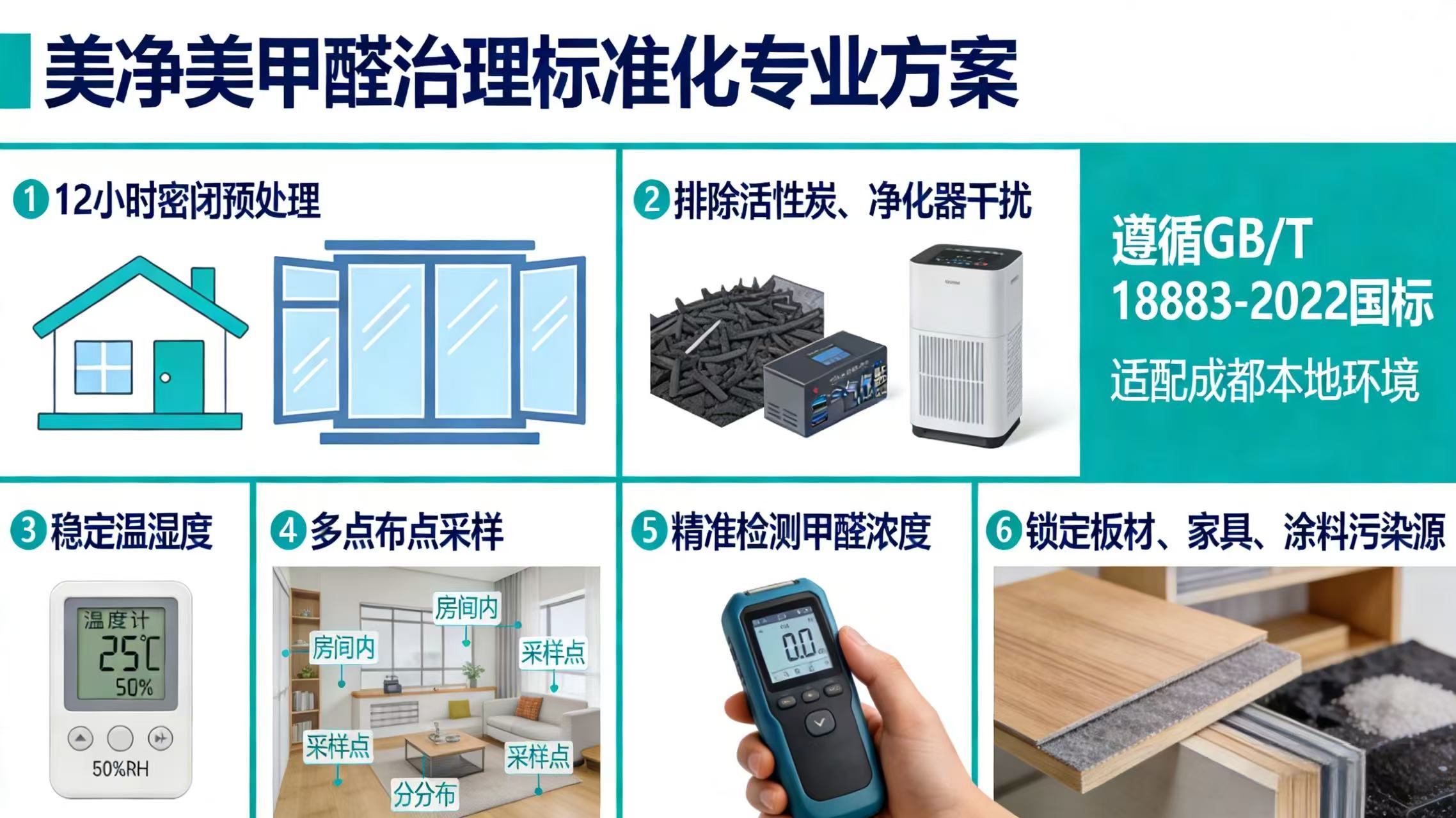 面对甲醛超标,美净美推出标准化专业方案,全程遵循科学规范,适配成都本地环境。治理前,严格依据 GB/T 18883-2022 国标,对房屋 12 小时密闭预处理,排除活性炭、净化器等干扰,稳定温湿度后多点布点采样,精准检测甲醛浓度,锁定板材、家具、涂料等核心污染源,避免盲目治理。
