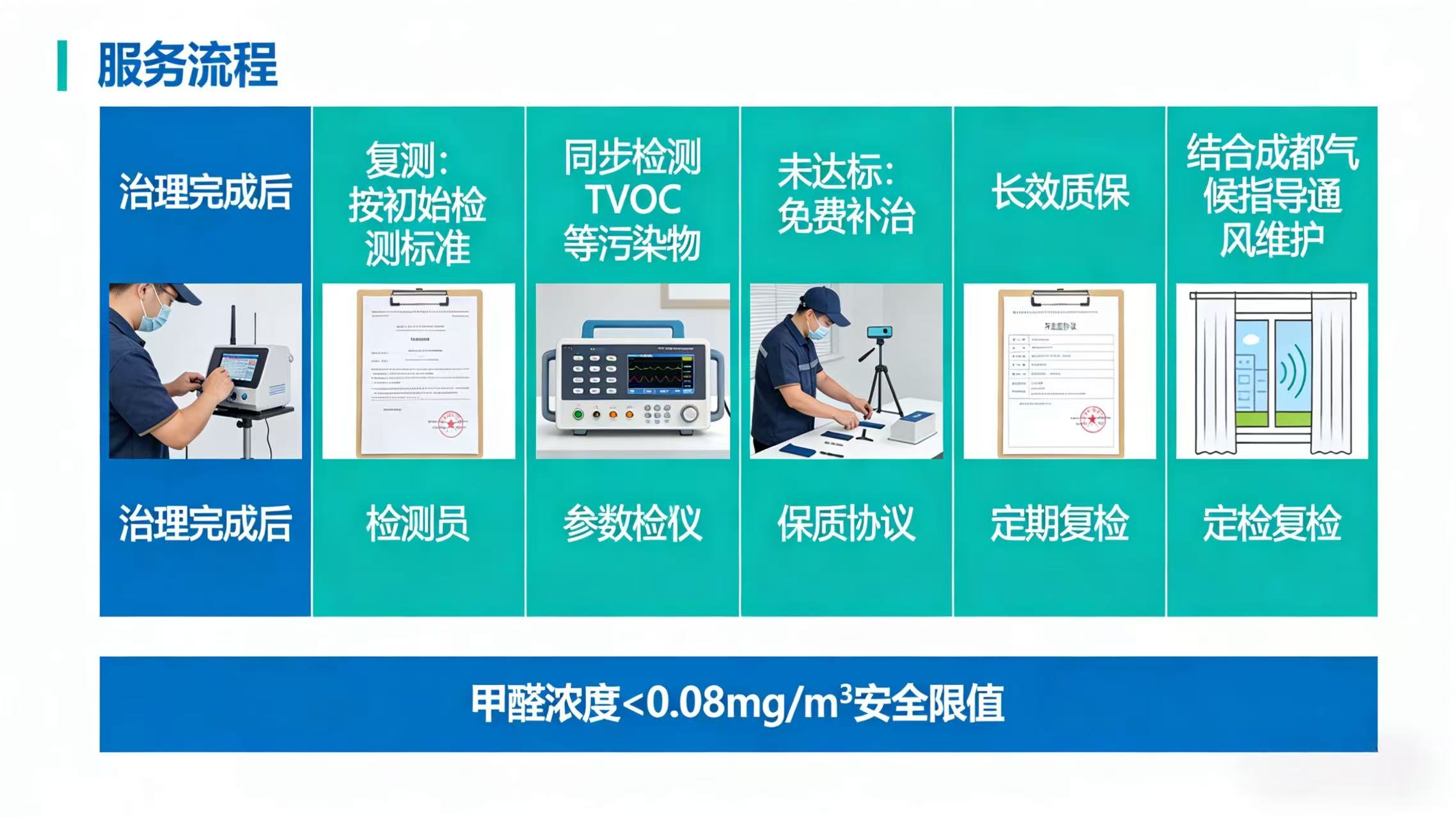 治理完成后,按初始检测标准复测,同步检测 TVOC 等污染物,未达标则免费补治。后续提供长效质保与定期复检服务,结合成都气候特点,指导日常通风与维护,确保室内甲醛浓度稳定低于 0.08mg/m³ 安全限值。