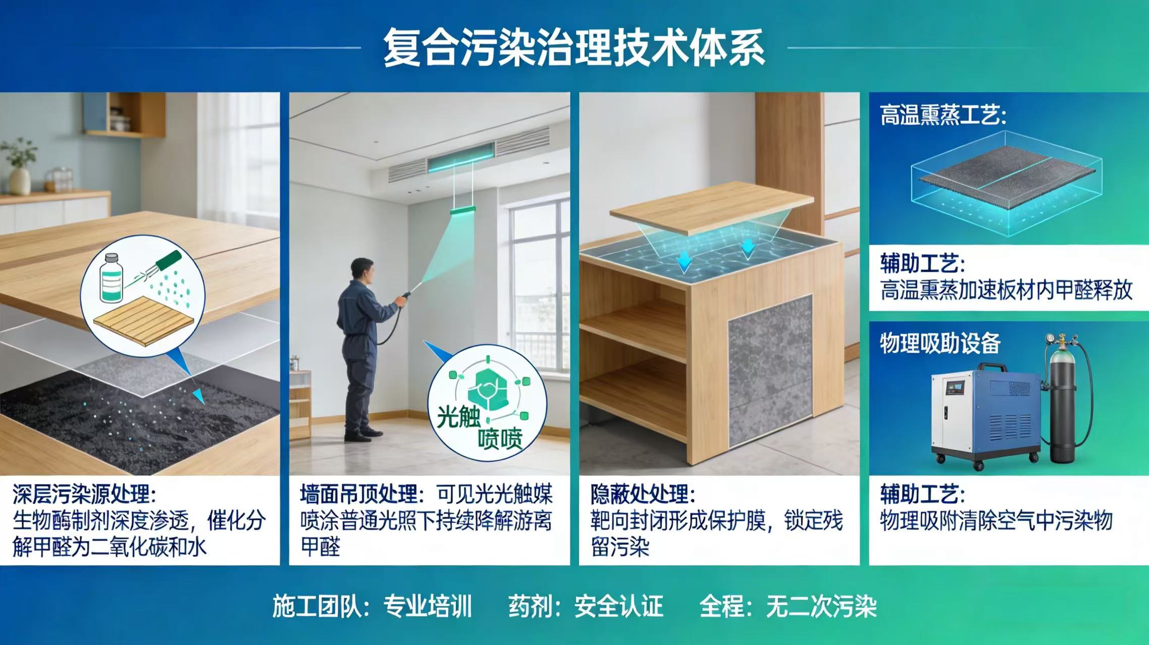 治理阶段采用复合技术体系,针对不同污染场景精准施策。对家具板材等深层污染源,用生物酶制剂深度渗透,催化分解甲醛为二氧化碳和水;墙面、吊顶等区域,以可见光光触媒喷涂,在普通光照下持续降解游离甲醛;家具接缝、板材切口等隐蔽处,实施靶向封闭,形成保护膜锁定残留污染。同时结合高温熏蒸工艺,加速板材内甲醛释放,配合物理吸附清除空气中污染物,全维度切断污染路径。施工团队经专业培训,药剂通过安全认证,全程无二次污染。